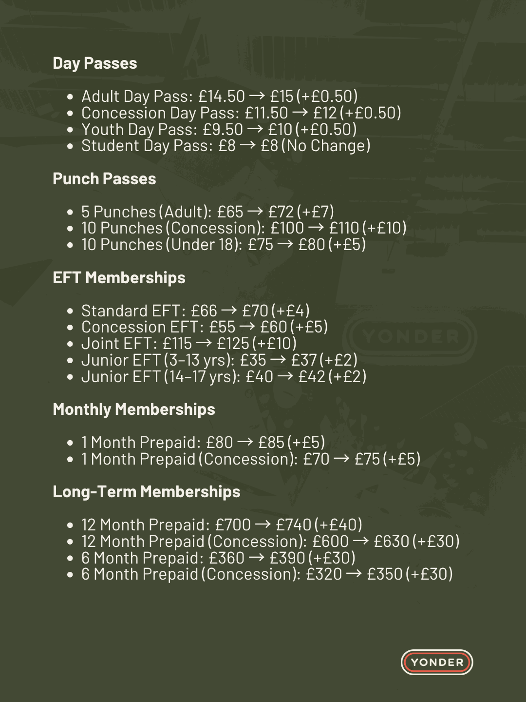Yonder has always been a a centre focussed on quality and community! As I’m sure you are aware inflation has impacted many aspects of life and unfortunately this also has big implications on Yonder as a business.